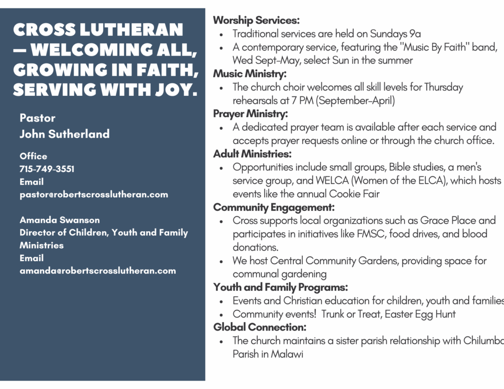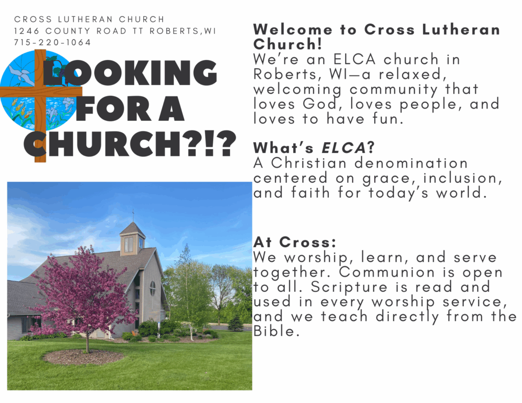 We are a “come as you are” congregation of Jesus followers who love God and each other. Our goal is to make all those that enter Cross Lutheran feel as welcome as you would entering the home of your family or best friend. We, the members of Cross Lutheran Church, are confident that our congregation will embrace our efforts to reach up, out, and forward and leave a legacy that will continue for generations to come in our community and the world around us. We exist to rejoice and praise God by creating followers of Jesus Christ in the surrounding areas and around the globe. Please join us as we celebrate our abundance and strive to create a safe community for future generations in Roberts, WI.